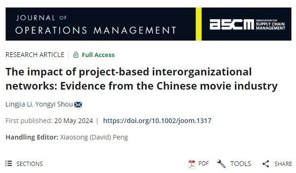 日前,浙大管院服务科学与运营管理学系寿涌毅教授、浙大管院博士毕业生李玲佳在国际权威期刊《Journal of Operations Management》(UTD24期刊),发表了相关研究成果The impact of project-based interorganizational networks: Evidence from the Chinese movie industry。