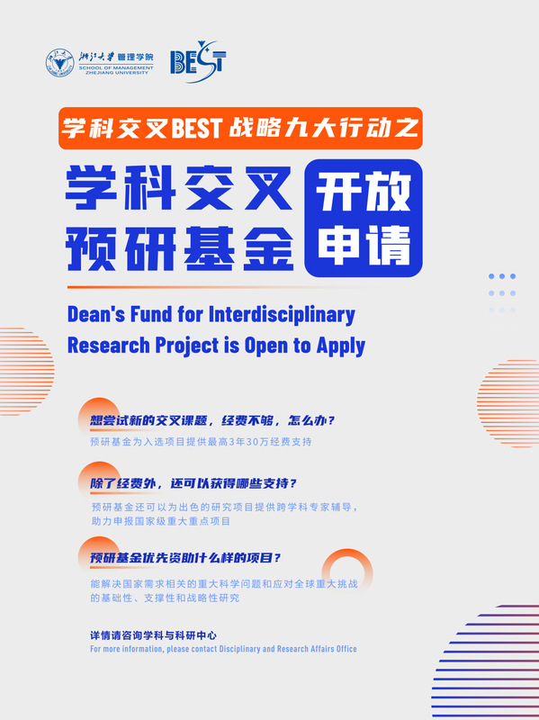 在“学科交叉BEST战略”引领下,浙大管院除了落实求是星辰青年学者计划,以构建开放、协同、高效的科研创新体系服务现代化产业体系外,还设立了“学科交叉预研基金”,资助跨学科研究项目的开展。院内学者们可以联合来自不同学科背景的研究团队共同申请该基金,以“学科交叉与创新”协同攻关国家需求相关的重大科学问题以及全球社会重大挑战,并孵化创新技术与未来产业。