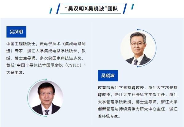 吴汉明院士长期工作在我国集成电路芯片产业并做出突出贡献。曾主持、参加了包括国家重大专项在内的0.13微米至14纳米七代芯片大生产工艺技术研发,攻克了包括刻蚀等一系列关键工艺难点,与世界先进水平差距缩小至3至5年。吴晓波教授30余年来在技术创新管理、全球化制造与创新、包容性创新、商业模式创新等领域开展了众多开拓性研究。于90年代初提出“二次创新管理”理论,为广大“后发企业”成功实现“追赶”指出有效途径和战略。近年来构建起基于中国领先企业创新管理实践的“C理论”,引领中国企业穿越周期,实现“超越追赶”。