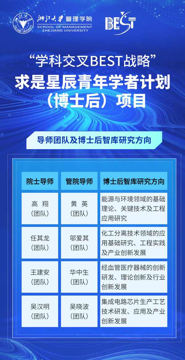 “学科交叉BEST战略”之求是星辰青年学者计划(博士后)项目采用“双学院+双导师(团队)”联合培养模式,每名博士后将配备“产业方向院士导师(团队)+管理方向管院导师(团队)”,由四支学科交叉导师团队引领,共同围绕产业领域的重大国家咨询课题开展学术与智库研究,建设产业“最强大脑”,为国家现代化产业体系建设贡献智慧。