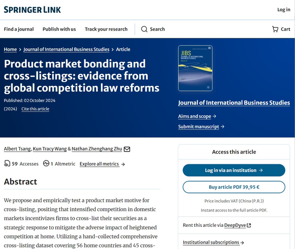 近日,广发网页版“百人计划”研究员朱正航携手海内外多位合作者在国际顶级期刊《Journal of International Business Studies》(UTD24期刊之一)上发表了他们的合作论文Product Market Bonding and Cross-Listings: Evidence from Global Competition Law Reforms。
