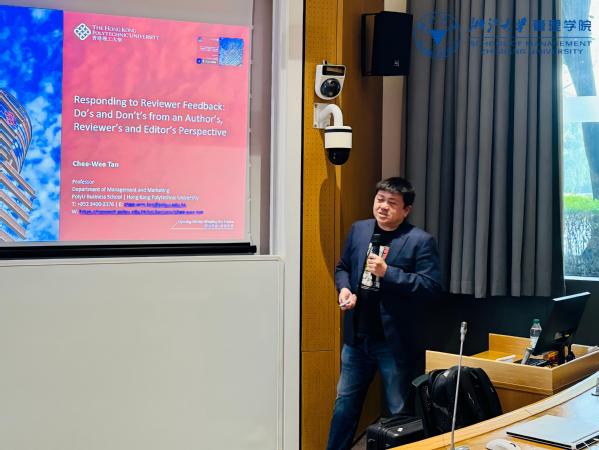 香港理工大学的陈致玮教授以“Responding to Reviewer Feedback:Do's and Don't's from an Author's,Reviewer's and Editor's Perspective”为主题进行了精彩的课程指导。陈致玮教授是信息系统领域的知名学者,他担任信息系统领域国际顶级期刊MlS Quarterly的Senior Editor,研究成果发表于MIS Quarterly,Journal of Operations Management,Information Systems Research等顶级期刊。 陈教授结合自己多年的编委经验和作为资深学者的投稿经验,详细讨论了如何专业且有效地回应审稿人的意见。演讲内容循序渐进,首先从宏观上探讨了回应时应有的总体考量,随后深入到具体的实用技巧。接着,陈教授总结了撰写回复信时可以遵循的“十条简单规则”,如“逐条回应审稿意见”“避免防御性语言”等,并进一步对审稿意见的各种类型及其相应的最佳回应策略进行了分析,现场学员纷纷表示受益匪浅。随后,在场同学就自己在投稿过程中遇到的问题与陈教授进行交流。报告见解深刻,不仅为在场的师生提供了宝贵的实战指导,也从更高层面启发大家以更积极、更成熟的心态去面对学术发表过程中的挑战。